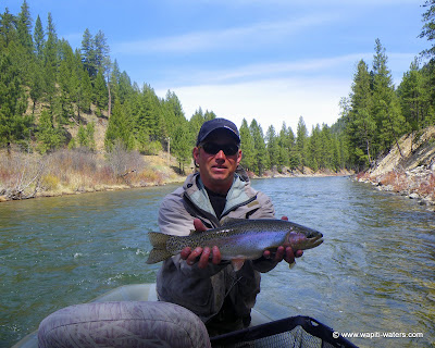 Dusty, Don, Jim, and Peter are from San Diego. They (and a few others of the group that didn’t make it this year) have been fishing with Wapiti Waters for many years. Spring is when they come, braving what ever weather the year brings for them. They are fun, great sports and always catch fish. Day one, on the Clark Fork, was nice weather. Day two and three were on the Bitterroot and it rained. We were thrilled to get the moisture and I think the catching was good.